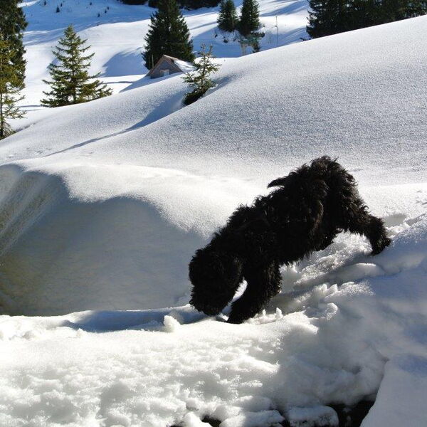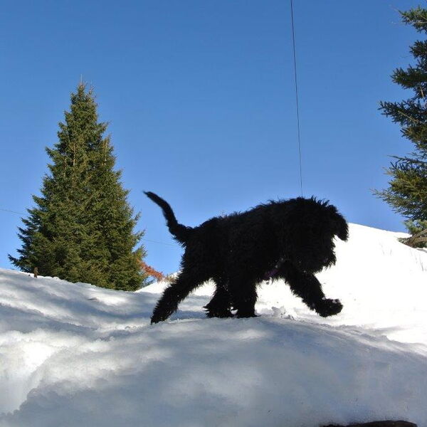 Schon bin ich 16 Wochen alt. Heute darf ich Sessellift fahren und dann im Schnee umhertollen.