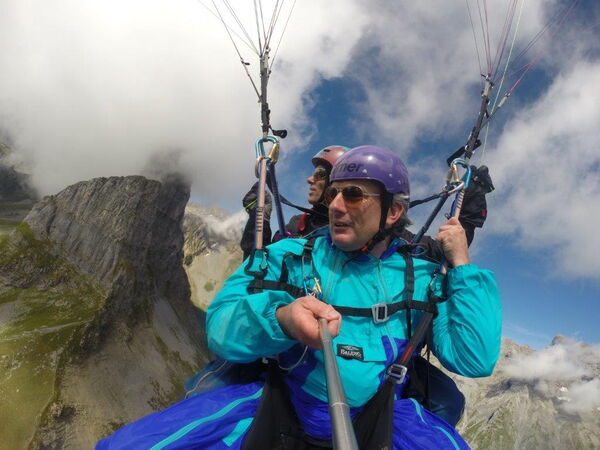 Der Pilot Michi Müller hat meinen Chef sicher zu Boden gebracht. Und ich darf die beiden begrüssen!